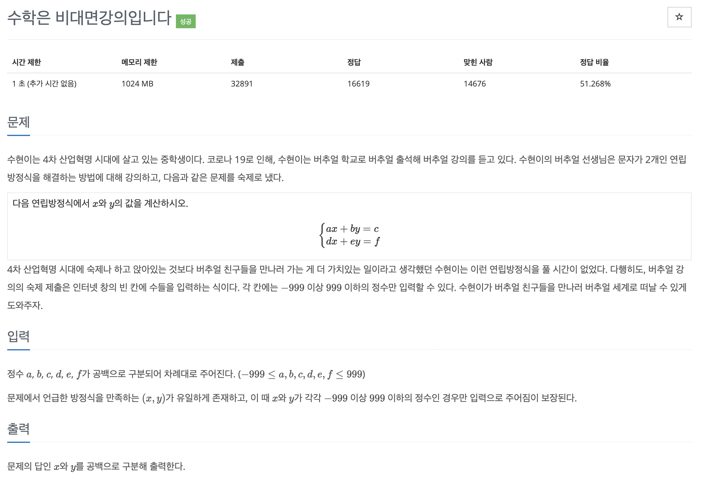이번에는 백준 브루트 포스 문제 중 연립방정식을 풀어야 하는 '수학은 비대면강의입니다'를 풀어보자.