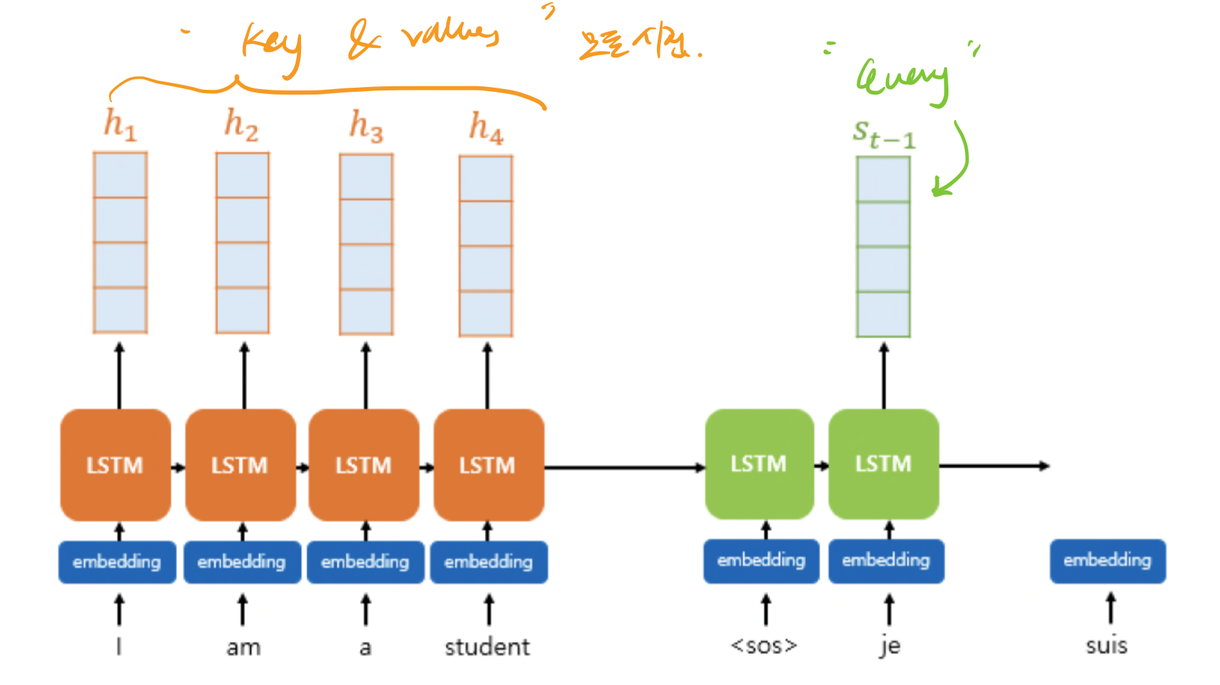 K (Keys): 모든 시점의 인코더 셀의 은닉 상태들