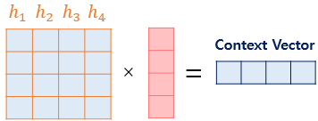 이젠 준비된 정보들을 하나로 취합하고, 어텐션의 최종 결과값을 얻기 위해서 각 인코더의 은닉 상태와 어텐션 가중치값들을 곱하고 최종적으로 모두 더해야한다 --> 이렇게 되면 가중합을 구하게 되는데, 이 벡터는 인코더의 문맥을 포함하고 있어 context vector라고 불리는 것이 특징이다.