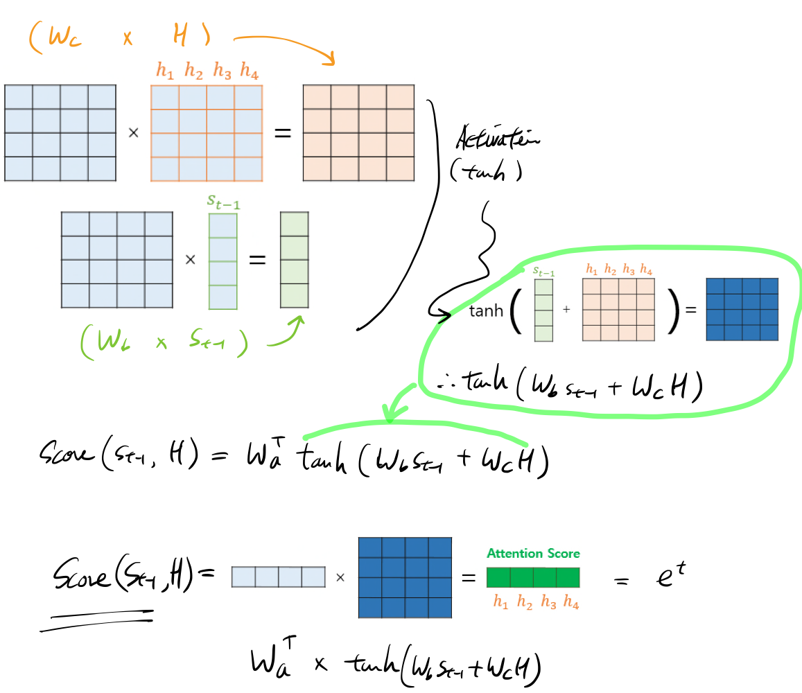 다른 어텐션 메커니즘과 다르게 여기서는 어텐션 함수의 Query가 디코더 셀의 t 시점의 은닉 상태가 아니라 t-1 시점의 은닉 상태임을 주목해야한다.