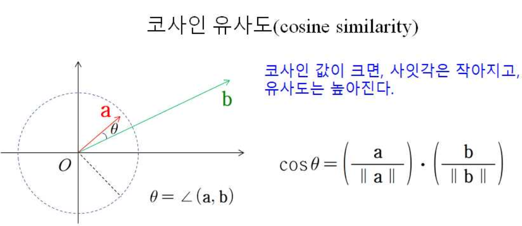 만약에 코사인 값이 크면, 코사인 함수 성질에 의해 사잇각은 작아지게 되고, 그에 따라 유사도는 높아진다.