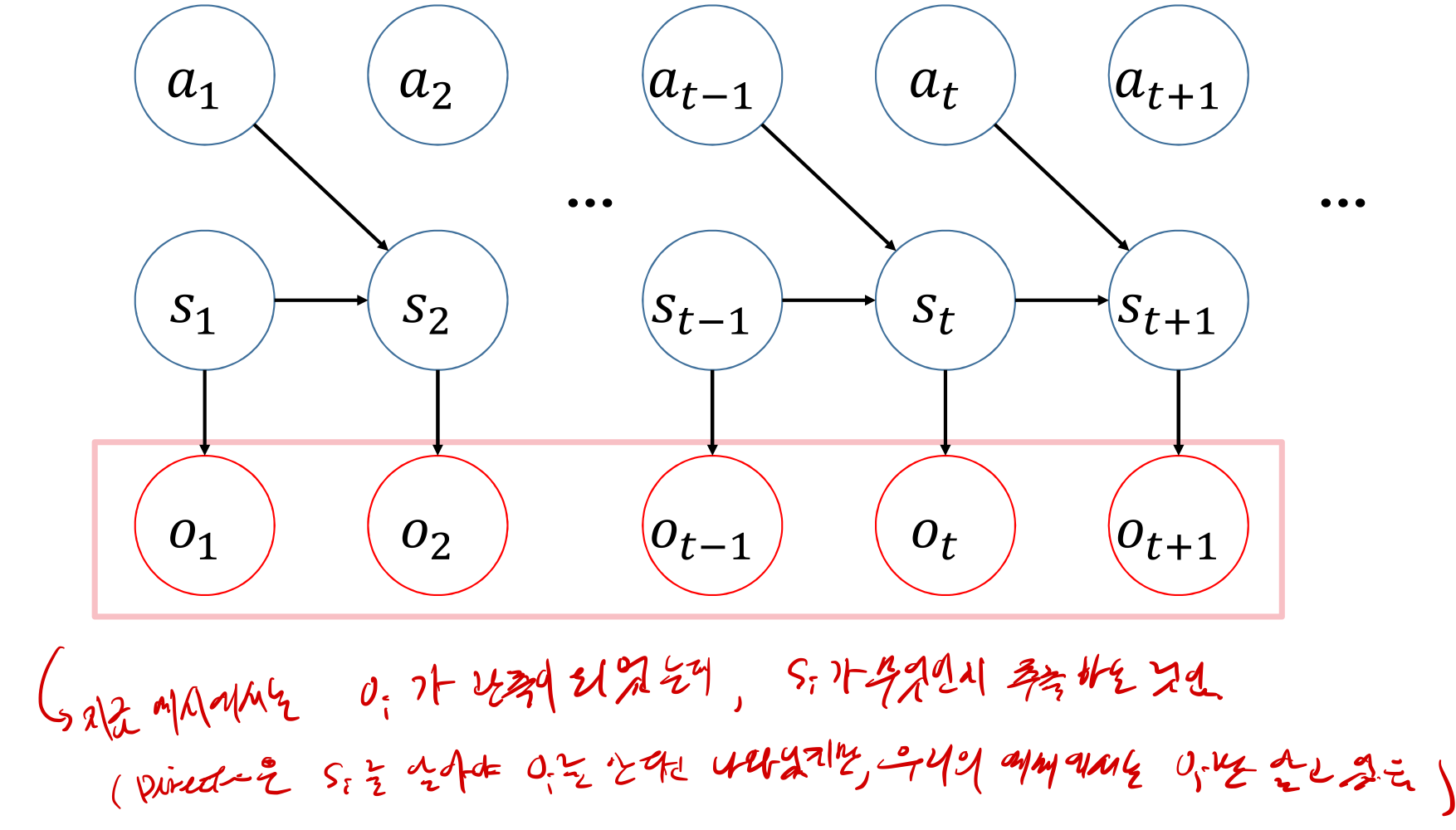 보통은 \(o_t\)만 알고 \(s_t\)를 유추하는 형태의 그래프가 되겠지만, 위 그림에선 \(s_t\)가 있을 때 확실한 \(o_t\)는 어떻게 되는지 표현한 그래프라고 보고 넘어가자.