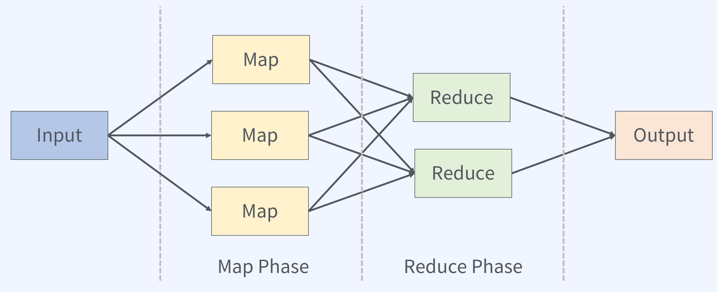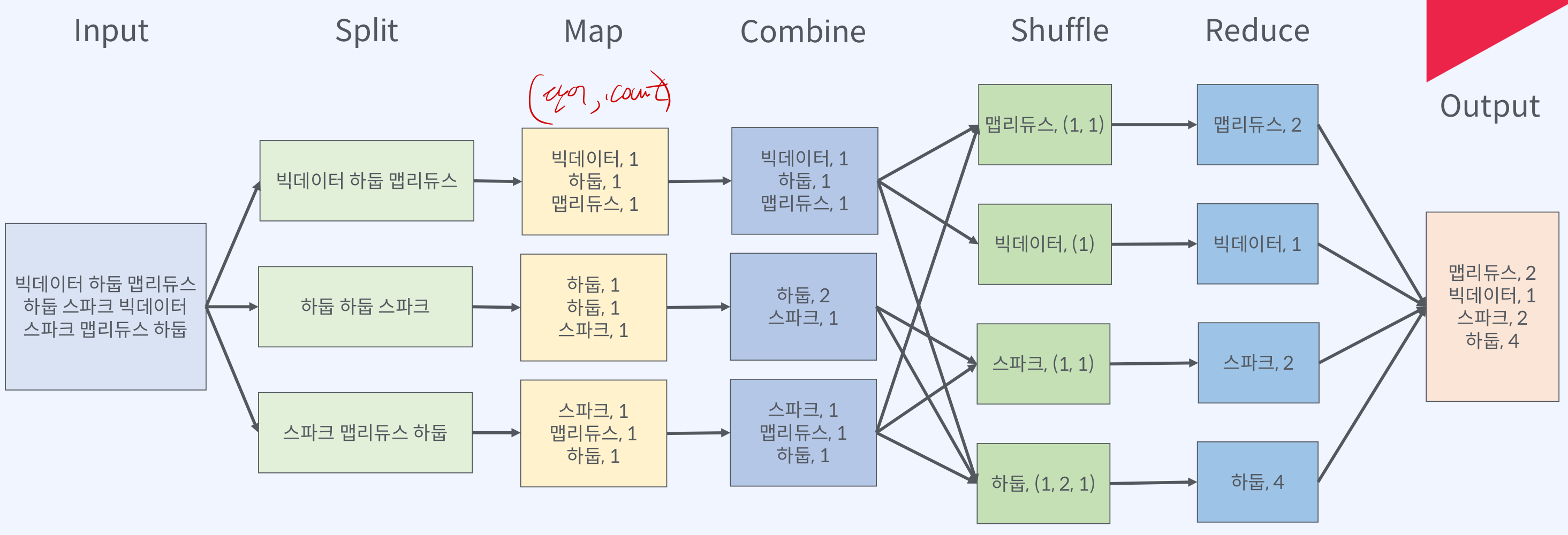 어떠한 input이 들어왔고, 이 input이 map이라는 블록으로 3개로 쪼개져서 분리가 됩니다. 그리고 이 3개의 map 블록을 거친 결과값은 2개의 reduce 블록으로 취합이 되고, 마지막으로 reduce의 결과값이 하나의 output으로 취합되는 그림을 볼 수 있습니다.