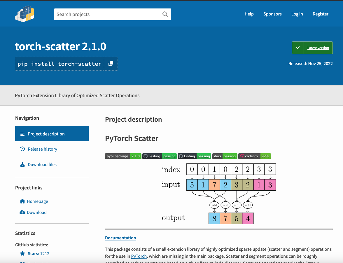 우선 torch-scatter 설치 가이드 페이지를 보겠습니다 (https://pypi.org/project/torch-scatter/)