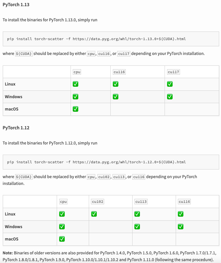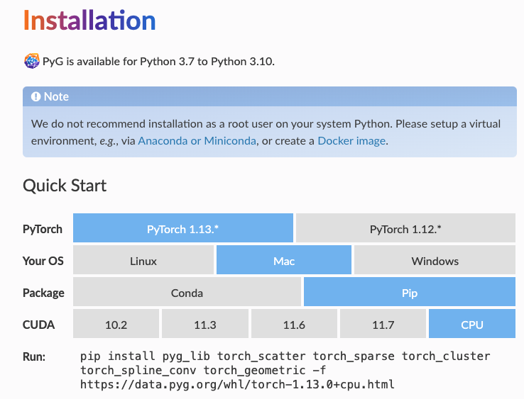 torch-geometric과 같은 경우에는 공식 도큐먼트 페이지에서 보다 친절하게 installation 가이드를 주고 있습니다. (https://pytorch-geometric.readthedocs.io/en/latest/install/installation.html)
