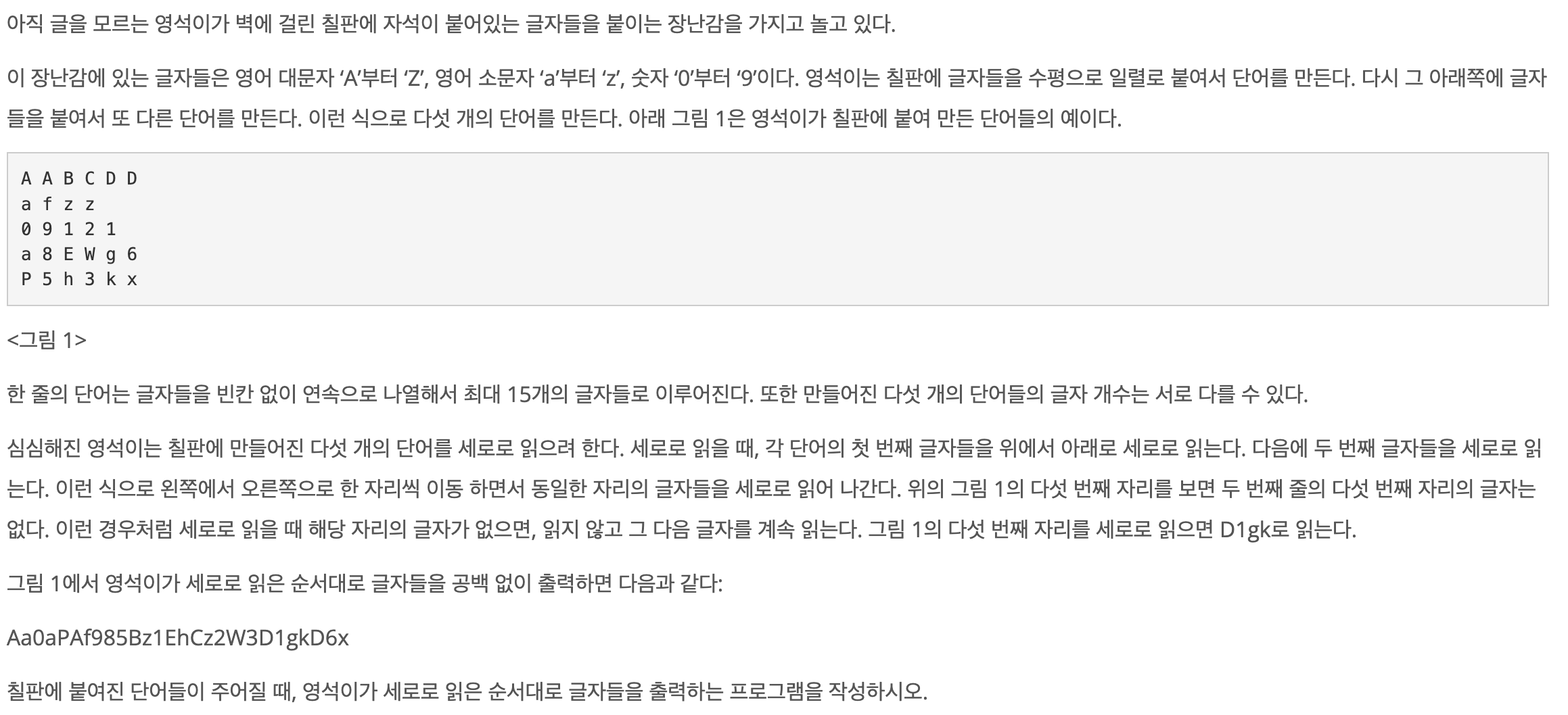 오늘은 10798번 문제에 대해 어떻게 풀었는지 공유해보겠습니다. (https://www.acmicpc.net/problem/10798)